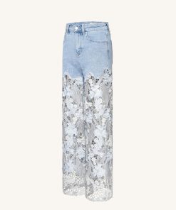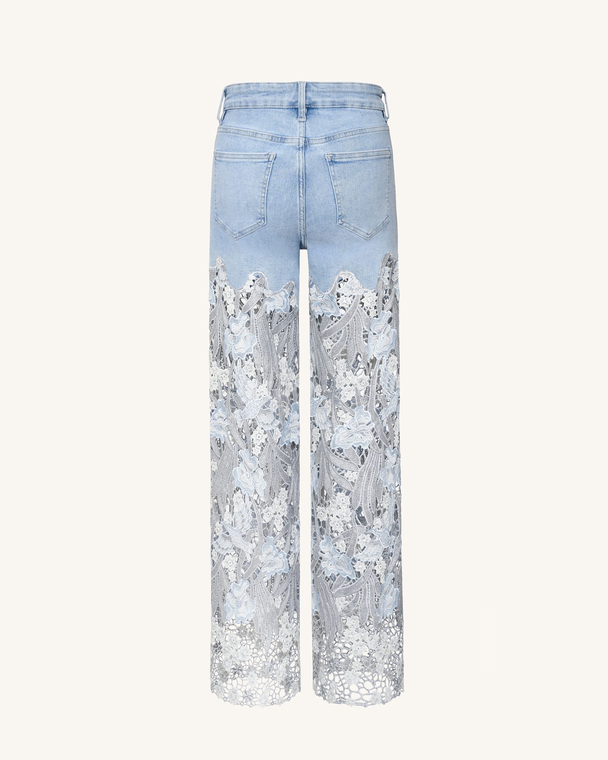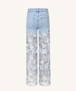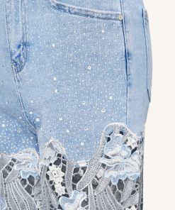 Embroidery High Rise Wide Leg Lace Denim Jeans With Rhinestone – Light Blue